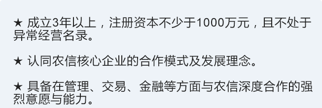 农信互联核心企业是指与农信全面合作的平台年费会员企业,依托农信平台生态圈体系,在管理、交易、金融、物流、服务等方面为平台合作企业进行全面赋能,通过实施企联网管理企业,企店管理经销商,猪联网管理猪场,实现管理效率的提升;依托农信平台推动产品交易的电商化,市场服务的数据化,开拓市场的金融化,核心客户共享化的服务模式的改变;共享农信互联网平台+农信运营中心线下渠道网络,实现产业链扩张。 合作对象:饲料、添加剂、动保、器械设备、原料等投入品生产加工企业。